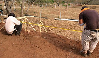 Мастер размечает свайное поле и место монтажа каждой опоры свайного фундамента.